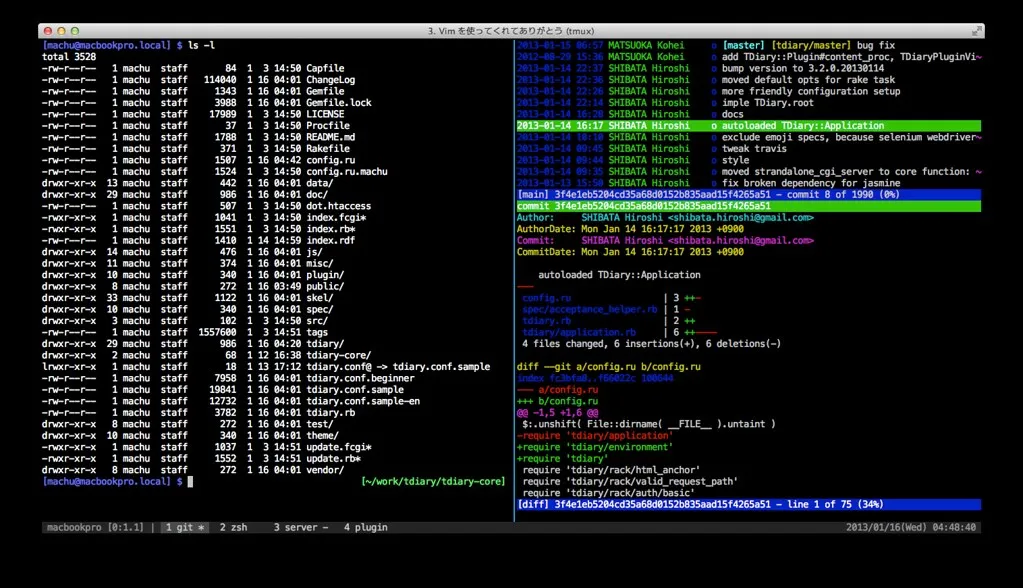 先日構築したtmux環境で、右半分にtigの画面を表示したところ。右画面で履歴を見ながら、左画面でファイルや git の操作ができて便利。